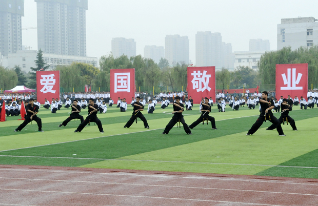 十时许,大会开始了宏大、壮观的军训汇报表演。表演由2000名女生的健身操、300名新生的双节棍、800名女生的手语操、700名新生的武警拳术和900名女生的大型团体操组成。表演或给人以优美,轻松的艺术享受,或给人以搏击的壮烈勇猛神速,以多变的艺术形式和时尚的舞蹈元素,赢得了现场观众的阵阵掌声。